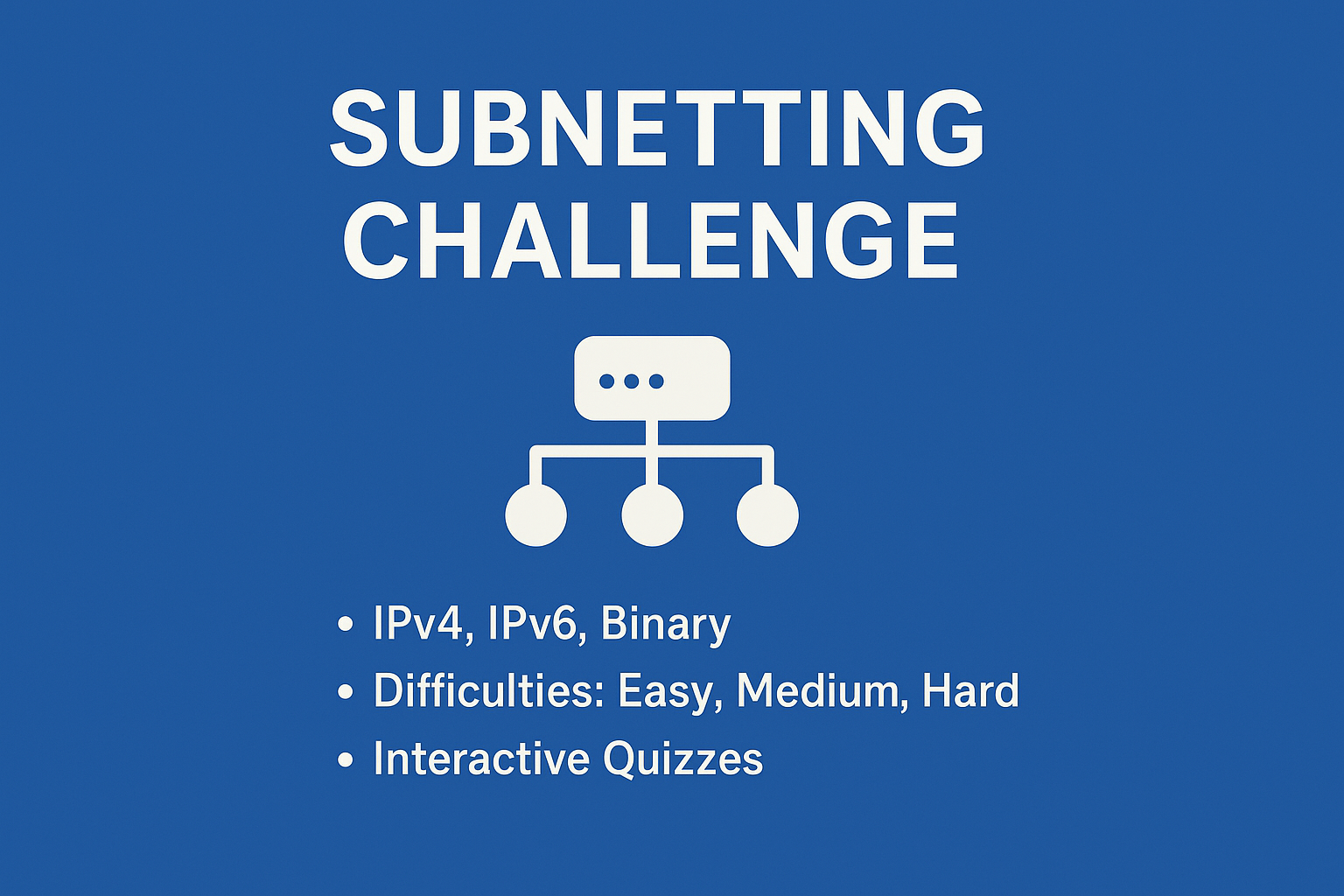 Master IPv4, IPv6, Binary, and VLSM through interactive quizzes and instant feedback. Ideal for CCNA and beginners in networking.